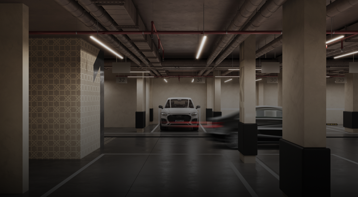 Многие заходят домой прямо с паркинга, поэтому особое внимание уделено его оформлению. Дизайн повторяет общий стиль лобби, этажей и входных групп. Везде прослеживаются восточные мотивы: от номеров парковочных мест до орнаментов на стенах.